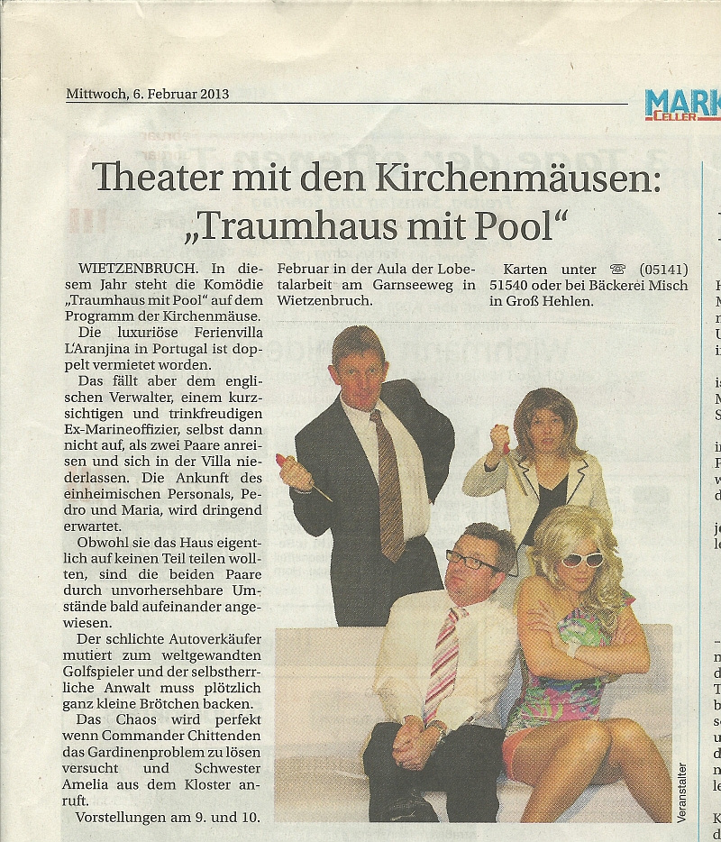 Im Februar 2013 spielten wir an vier Tagen die Komödie "Traumhaus mit Pool" von Michael Pertwee und John Chapman.